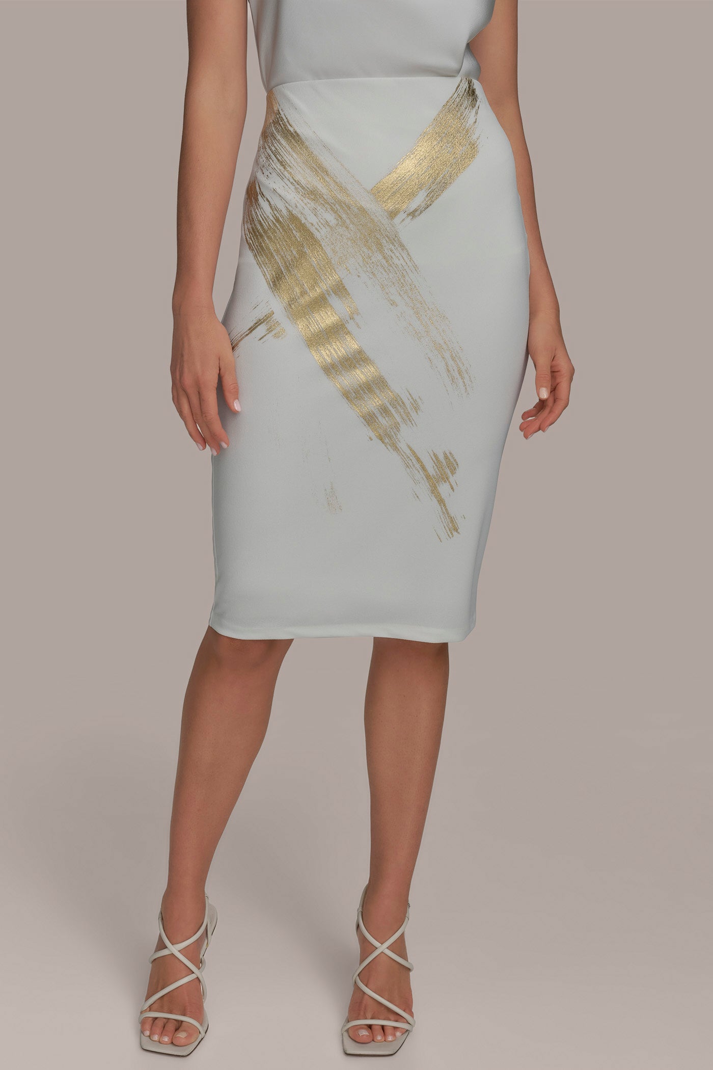 & Free ShippingMetallic brushstroke detailing transforms this knit pencil skirt with artistic flair. Tailored with a versatile midi-length hem, it blends all-day ease with statement-making elegance.